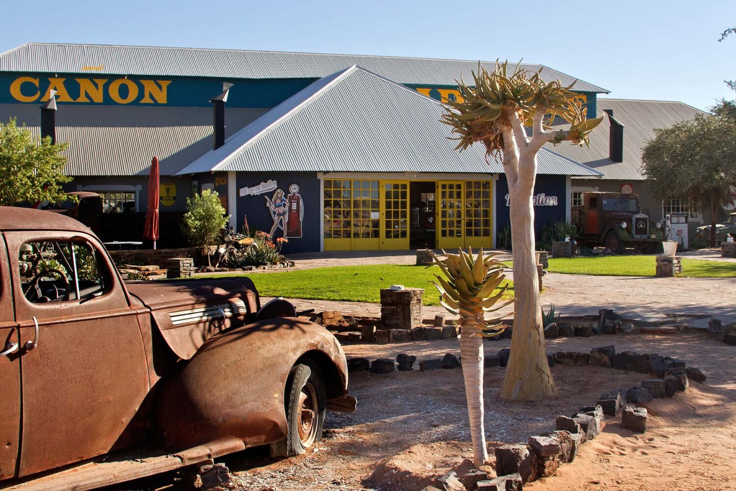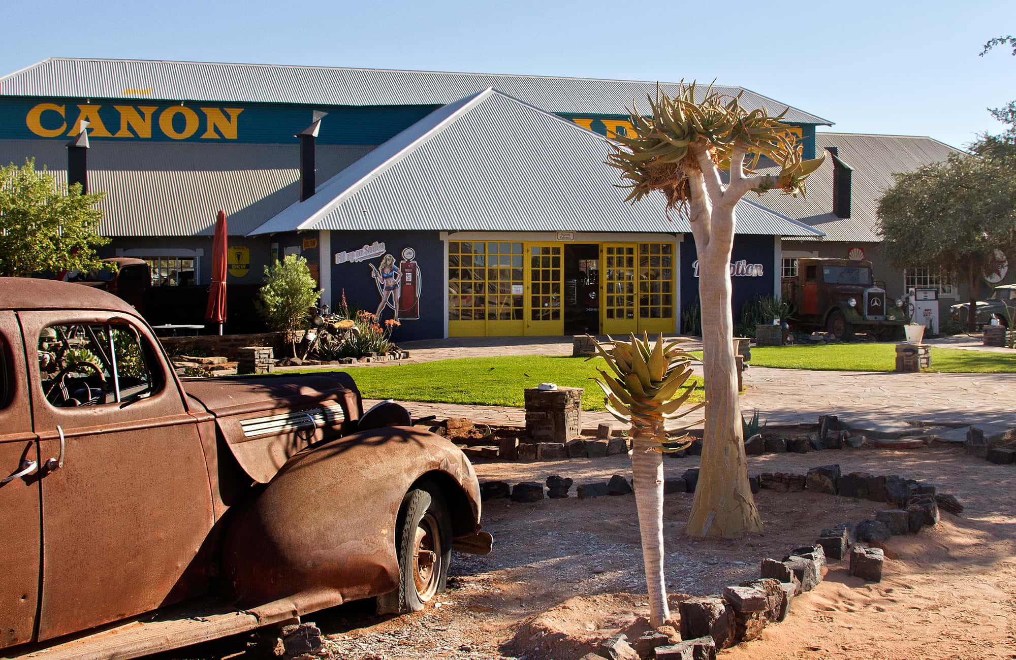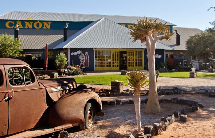 Namibia’s Fish River Canyon – the second-largest canyon in the world – is calling! Take the tar road southwards to Keetmanshoop, this capital of the Karas region features a small monument to karakul sheep farmers and a museum housed in the old church. Another more adventurous route will take you along Gochas and Koës, through hills and past memorials to fallen soldiers. From Keetmanshoop, turn onto the gravel road near Naute Dam, passing an emerald oasis of palm trees and vineyards. Make a stop at the Naute Kristall distillery to taste a range of desert schnapps. The road now leads through the Gondwana Canyon Park, a 130 000-hectare private nature reserve, past the old limestone kiln at Holoog, which is visible before the turn-off to the Fish River Canyon and Canyon Roadhouse. The red-roofed Roadhouse appears 16km further on with its wonderful collection of classic automobiles. You have reached your friendly and colourful home for the next two nights, to rest, explore, and fill up on smiles and its famous Amarula cheesecake.