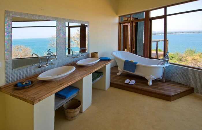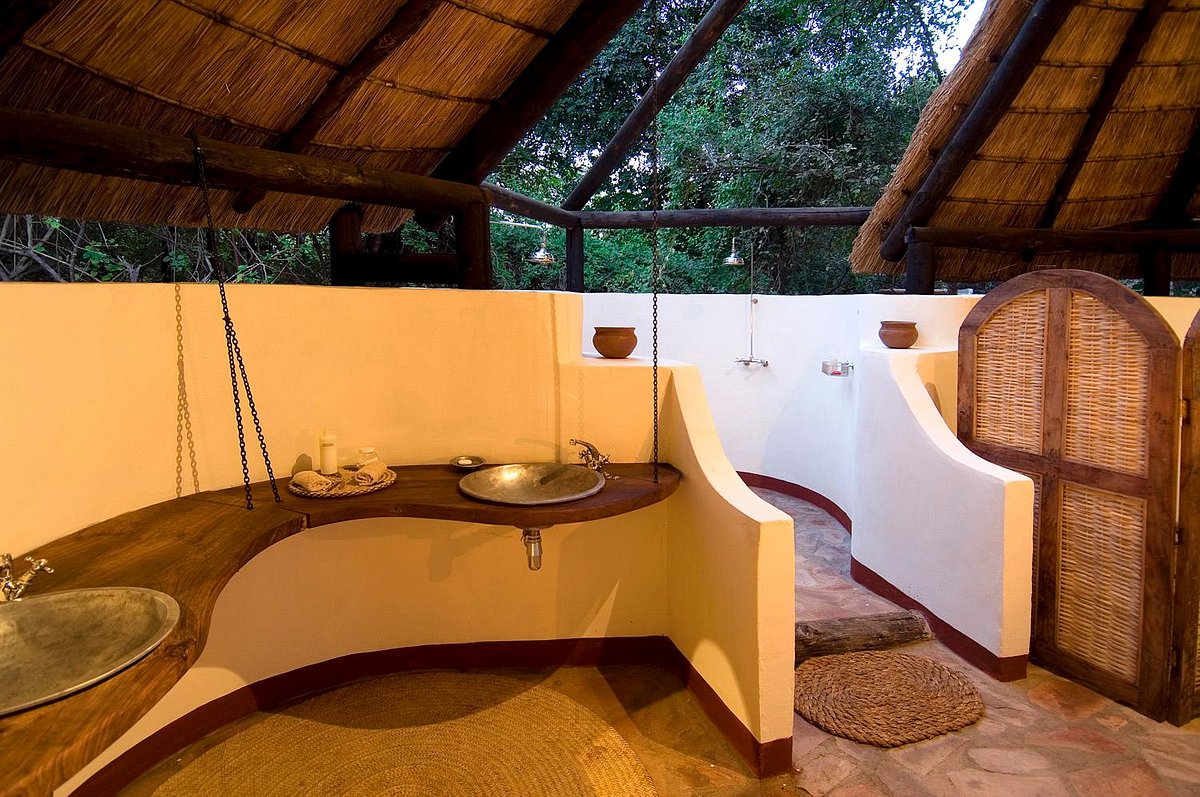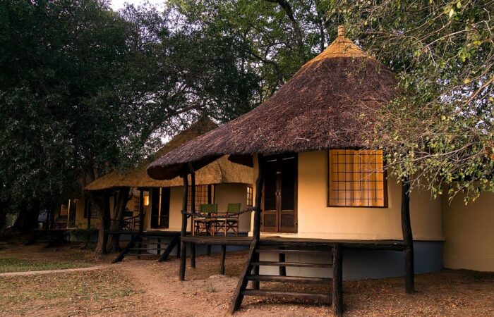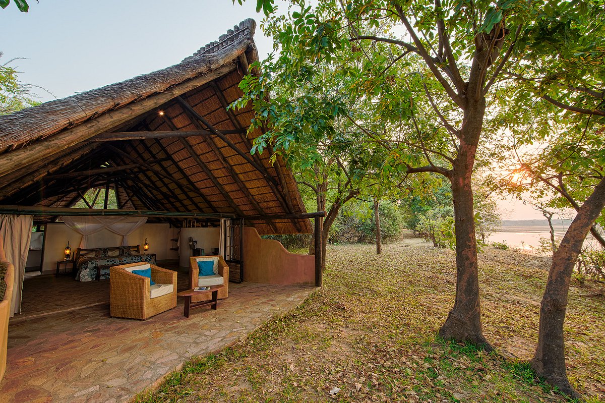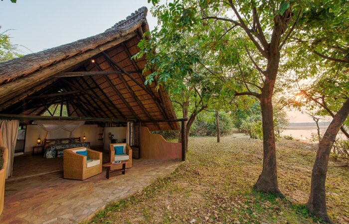 With only six chalets with bamboo woven walls and thatch roofs, Nkwali is a small intimate camp. All six rooms look out over the river and have open-air bathrooms.