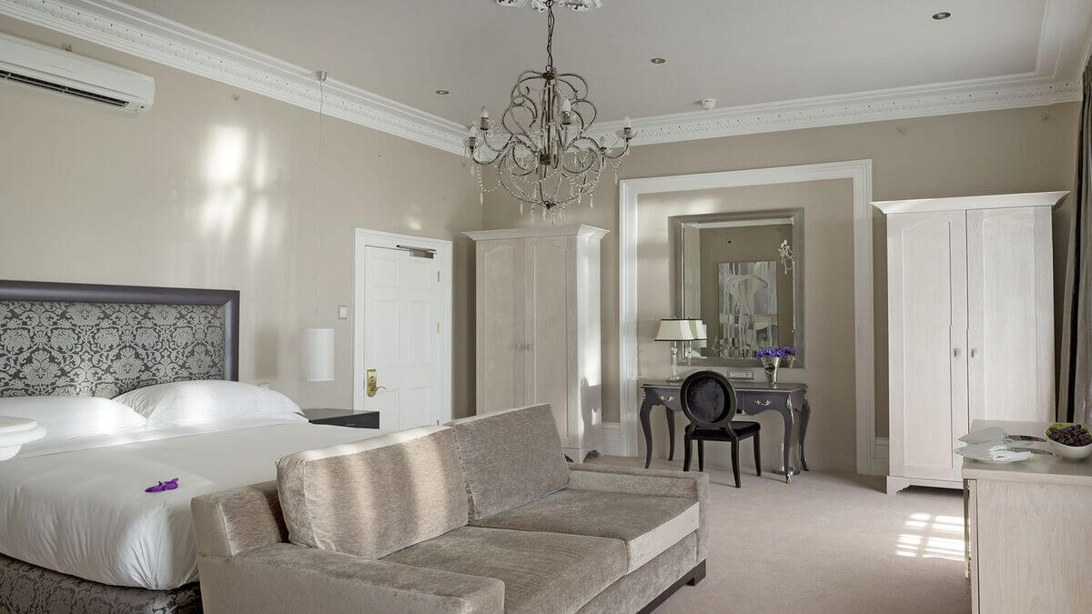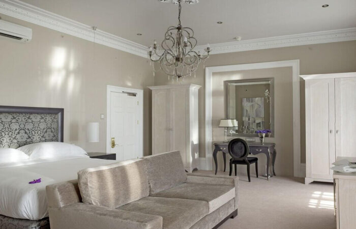 The hotel’s charming exterior gives way to an opulent world beyond its front door. Chandeliers and ornate ceiling cornices, among other fine touches, create a sense of Victorian elegance.