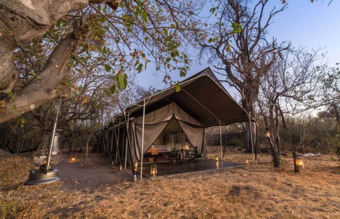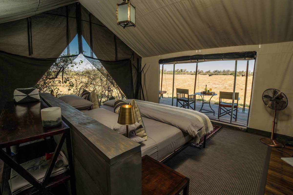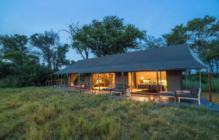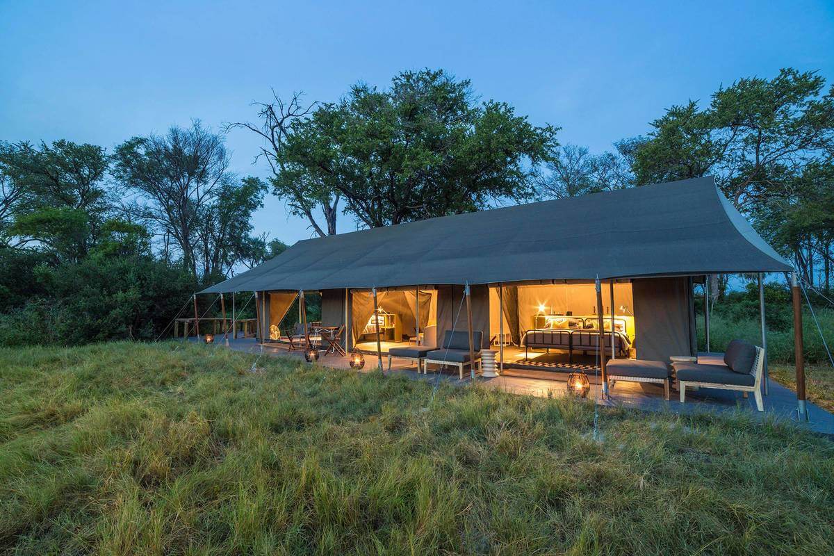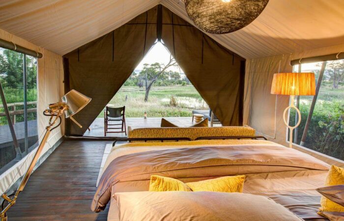 Situated on the edge of the Gomoti River system and floodplains in the centre of the Okavango Delta, Gomoti Plains Camp is nestled into evergreen riparian woodland with the central area featuring a beautifully outfitted large mess tent full of colour and style, housing the dining area and lounge, a perfect spot to relax in between morning and afternoon
