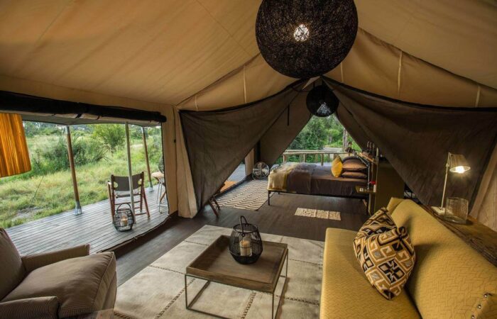 Accommodation is in ten classic safari tents (two of which are family tents). Each tent is tastefully furnished with safari-style décor and is equipped with stunning teak chairs and a wardrobe. All raised on wooden decks, the tents boast great views of the floodplains beyond, and each room has a shaded veranda.