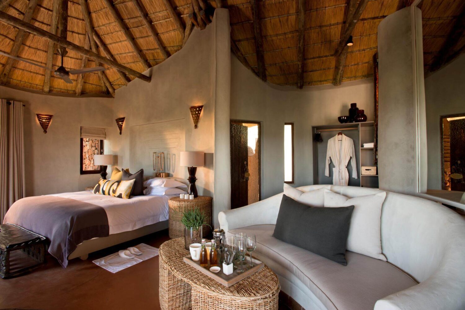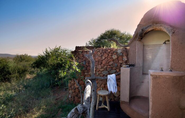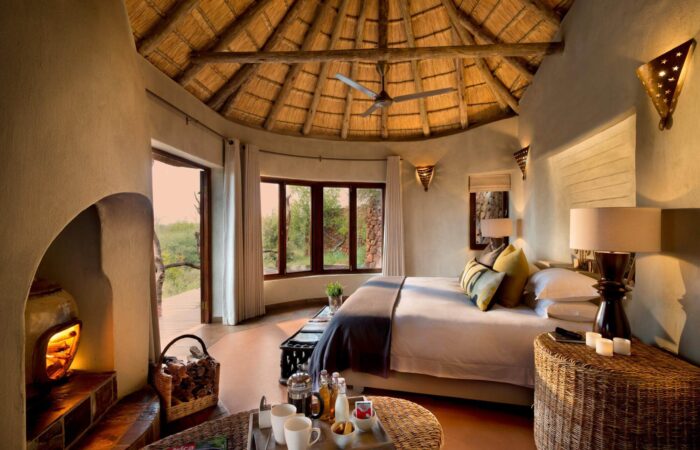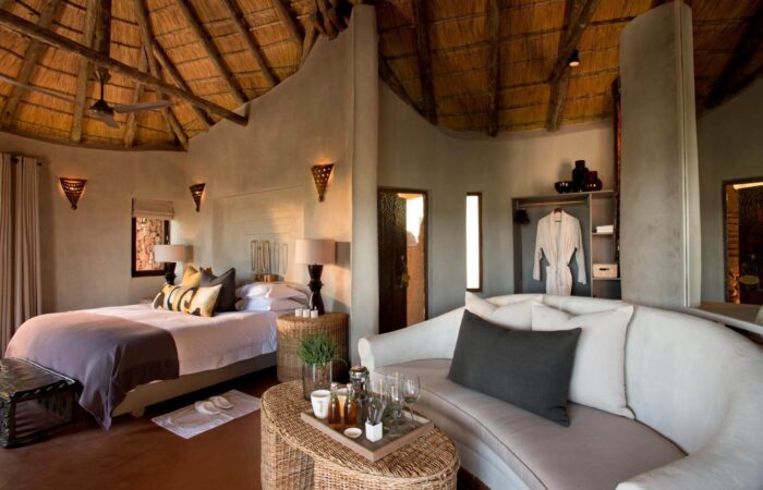 Nestled on the gentle slopes of the breathtaking rolling hills above Madikwe’s flat plains, is the authentic African Madikwe safari lodge with its chimneys and conical roofs camouflaged carefully into the surrounding bushveld. Madikwe Safari Lodge reflects the hospitality of the tough inhabitants of the untamed corner of the gorgeous south of Africa. Your accommodation is in a Thatched Suite at Kopano Camp.